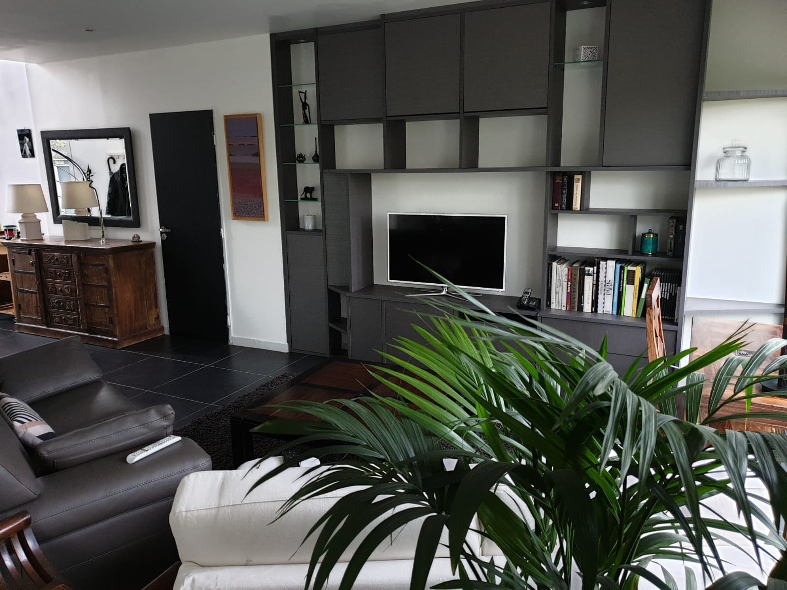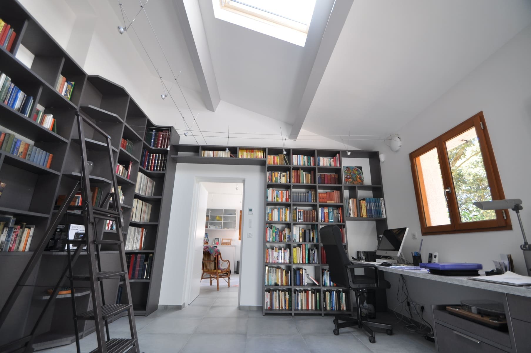 • Le client avait une pièce dédiée au travail et à la détente. C’est pourquoi nous avons aménagé une partie travail avec un grand bureau et un ensemble bibliothèque qui permet au client de mettre en valeur ses livres ainsi.