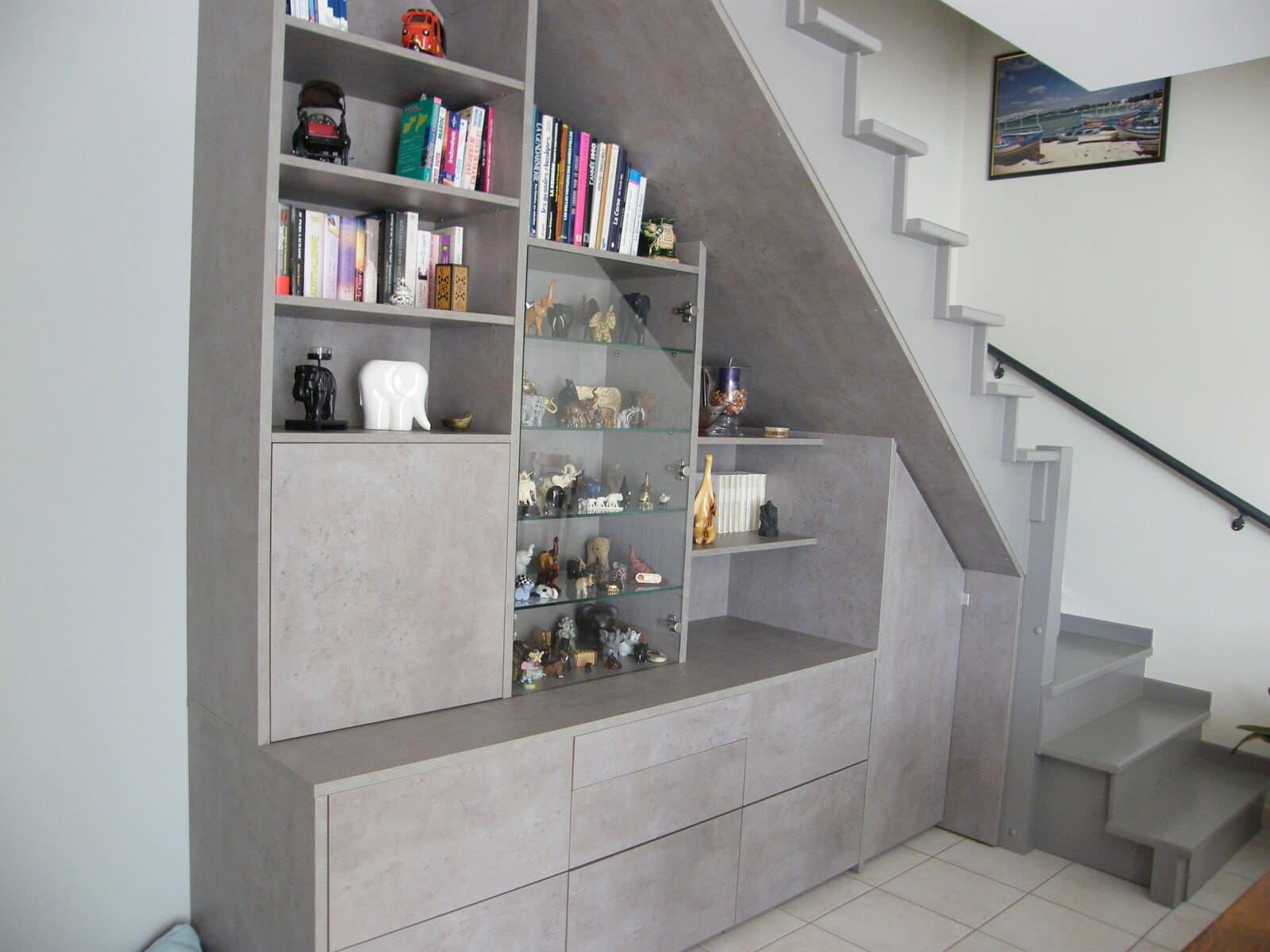 • Nous avons réalisé chez M. G une composition de meuble TV et bibliothèque. En accord avec le client, nous avons joué sur des parties fermées avec des portes battantes ainsi que des niches ouvertes permettant de créer un style légèrement déstructuré à l’ensemble.