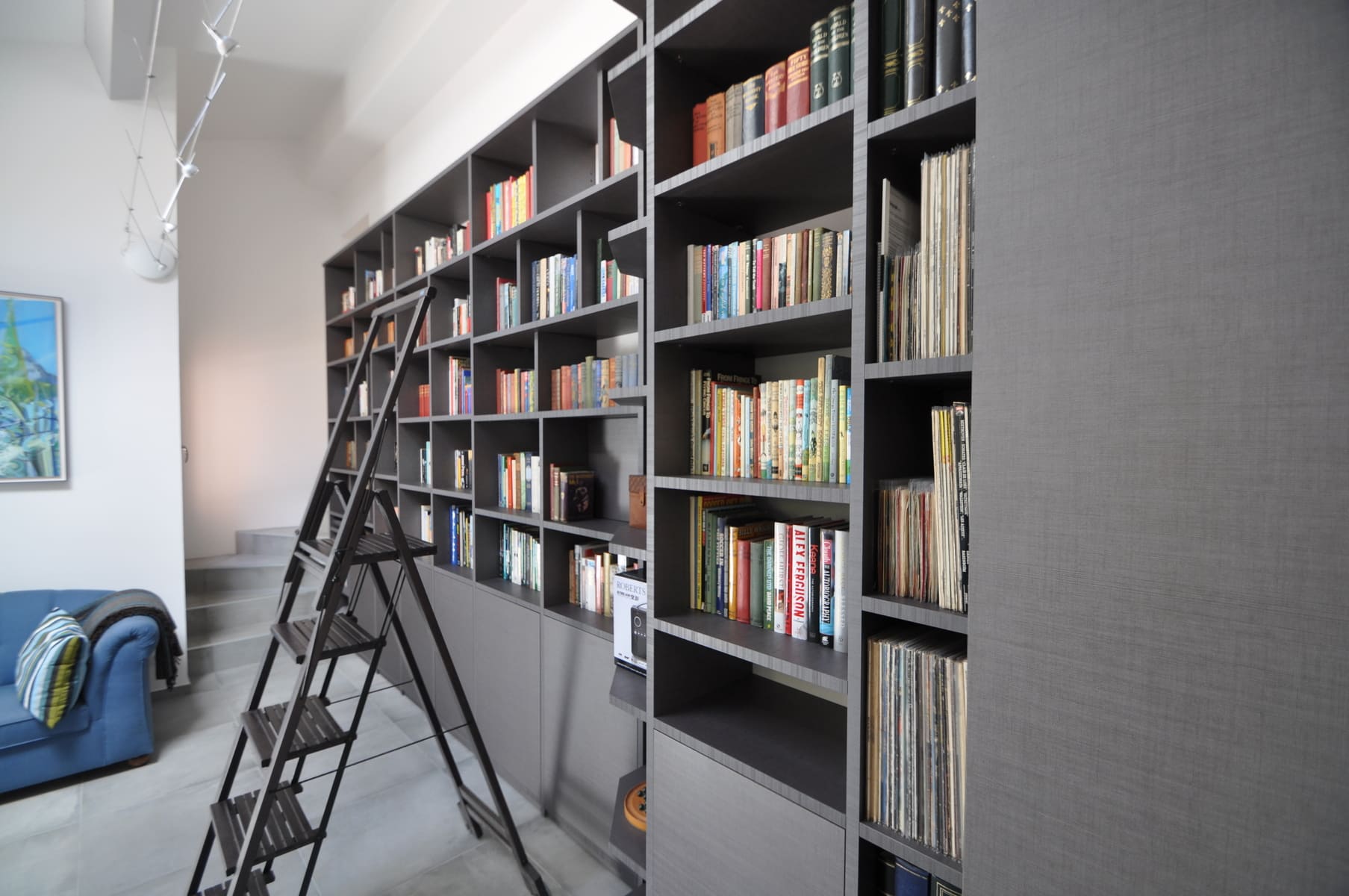 • Le client avait une pièce dédiée au travail et à la détente. C’est pourquoi nous avons aménagé une partie travail avec un grand bureau et un ensemble bibliothèque qui permet au client de mettre en avant ses livres.