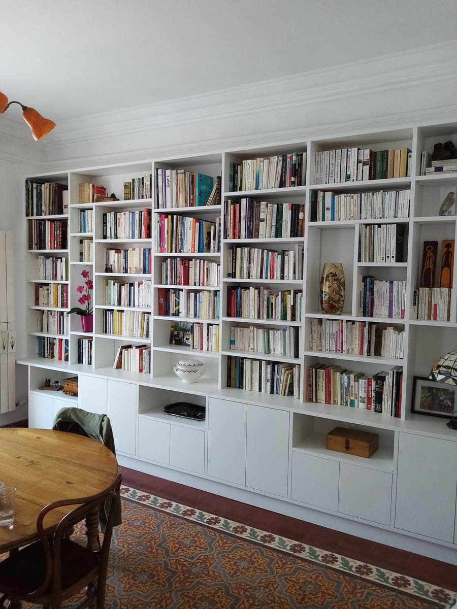 • Nous avons réalisé pour MME et M. B une bibliothèque blanche légèrement destructurée pour le séjour de leur maison à Saint-Mathieu-de-Tréviers