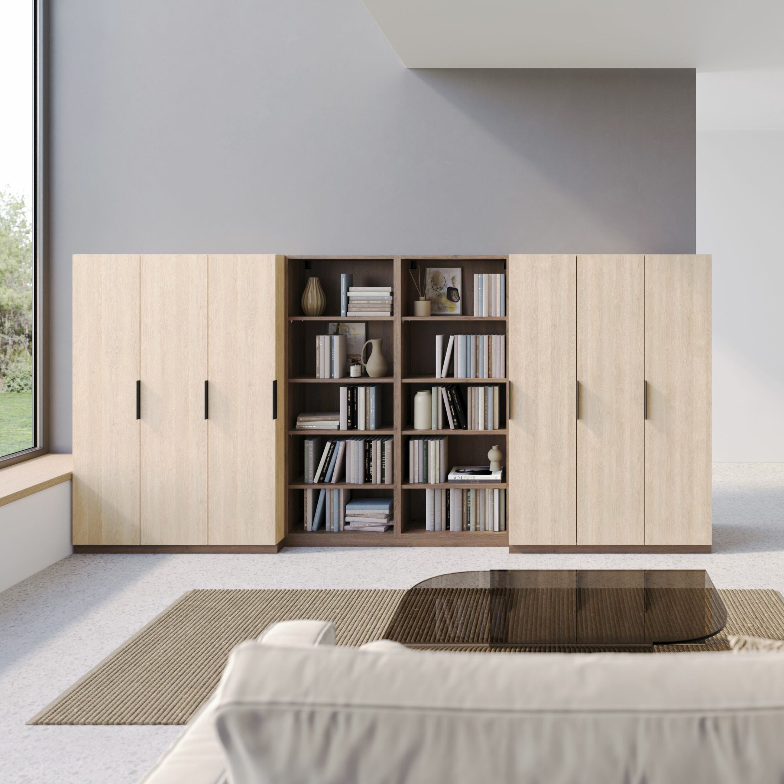 Pour maximiser le rangement dans votre bibliothèque, nous pouvons intégrer des portes battantes en partie basse ou réparties, offrant un style déstructuré et tendance. Cela permet de personnaliser votre espace selon vos préférences tout en préservant une esthétique harmonieuse.